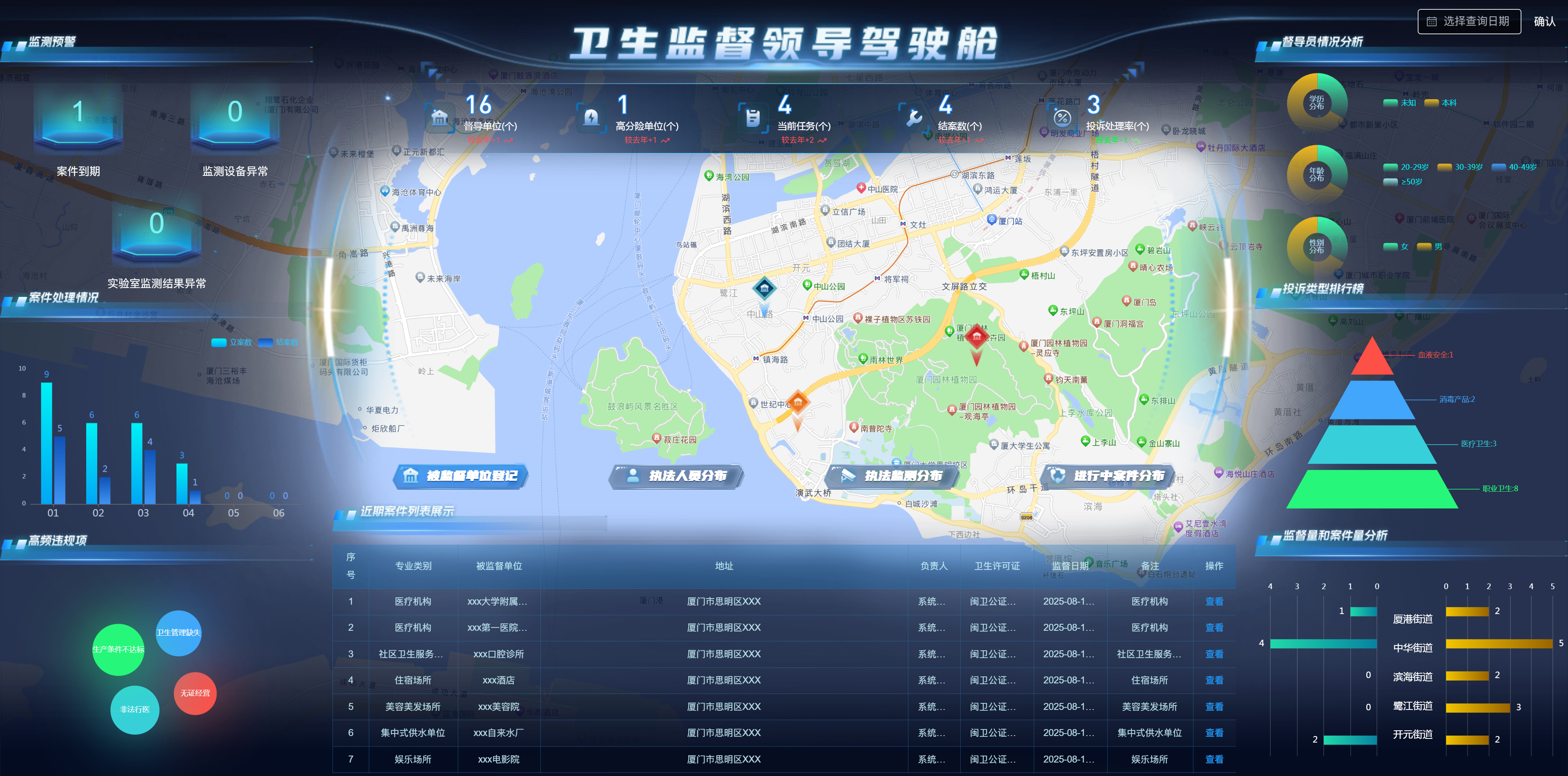 “智慧衛(wèi)監(jiān)綜合監(jiān)管服務(wù)管理系統(tǒng)”涵蓋監(jiān)督執(zhí)法應(yīng)用、非現(xiàn)場(chǎng)執(zhí)法應(yīng)用、碼上監(jiān)管、可視化駕駛艙、信息交換系統(tǒng)等內(nèi)容,實(shí)現(xiàn)加強(qiáng)衛(wèi)生監(jiān)督綜合執(zhí)法能力建設(shè),依法推進(jìn)衛(wèi)生監(jiān)督工作,不斷創(chuàng)新衛(wèi)生監(jiān)督執(zhí)法手段,提高衛(wèi)生監(jiān)督的監(jiān)管和應(yīng)急處置水平,通過建設(shè)智慧衛(wèi)監(jiān)系統(tǒng),將傳統(tǒng)現(xiàn)場(chǎng)監(jiān)管與非現(xiàn)場(chǎng)物聯(lián)網(wǎng)智能監(jiān)督監(jiān)測(cè)手段相結(jié)合,解決目前衛(wèi)生監(jiān)督機(jī)構(gòu)無(wú)法及時(shí)掌握和處置突發(fā)狀況的問題,做到在第一時(shí)間獲取現(xiàn)場(chǎng)數(shù)據(jù),在事件發(fā)生、升級(jí)前提前預(yù)警和處置,提高執(zhí)法效率。